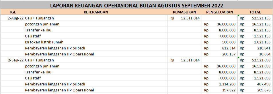 Laporan Keuangan Gaji, Tunjangan, dan Laporan Keuangan Agustus dan September 2022 Posted on November 22, 2022 by sak 22 Nov Berikut jumlah Gaji dan Tunjangan yang saya terima bulan ini: Dan berikut adalah biaya operasional saya di bulan ini: sak Gaji, Tunjangan, dan Laporan Keuangan Juni dan Juli 2022 Ima Mahdiah Beri Alarm Kadis Tata Air: Lanjutkan Turap